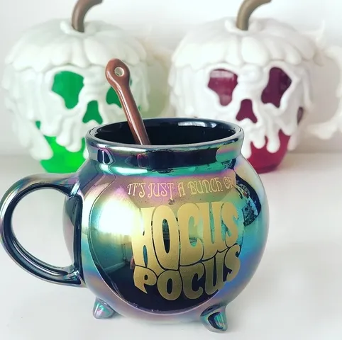 Stir up trouble with this Hocus Pocus mug! Featuring a sculpted design inspired by the iconic cauldron, the chrome mug comes with a spoon shaped like a broom.
